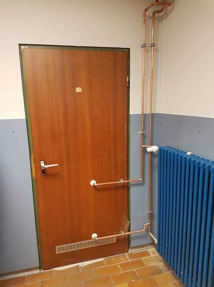 If you need the perfect way to block a door, just run some pipes through it! No one’s getting in—or out—without a complete renovation.